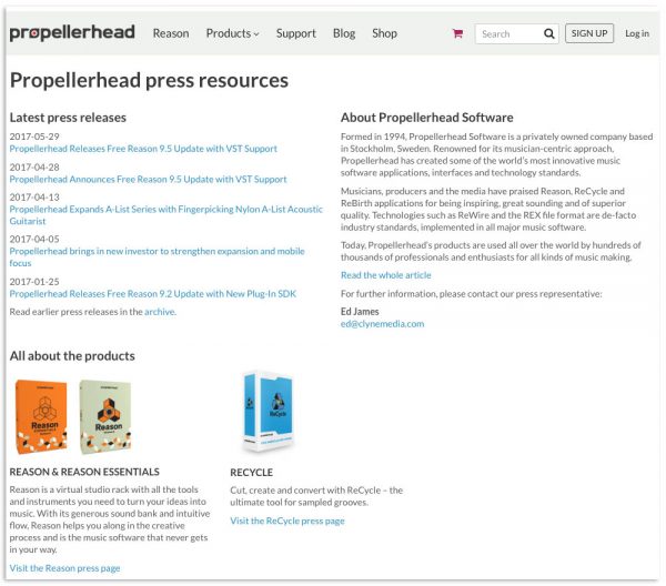Propellerheads utmärkta sida med resurser för pressen. Du har redan fakta på plats. Nu måste du se till att alla kontaktuppgifter finns enkelt tillgängliga i din pressrelease… och inte minst andra resurser. Finns det en landningssida där journalisten kan läsa vidare i ämnet? Har du en pressida med bilder och logotyper?